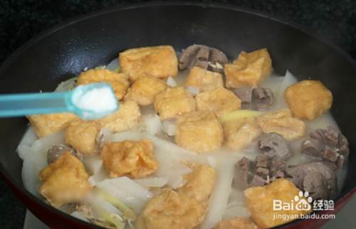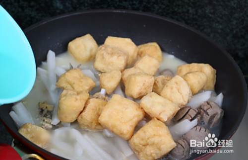 倒进萝卜条和豆腐泡,再倒入2饭碗开水,然后遮上锅盖,大火炖煮食材再次沸腾,汤汁发白。