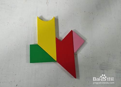 接着在三角形的左侧,放上红色形状挨着,上端一齐,如图。