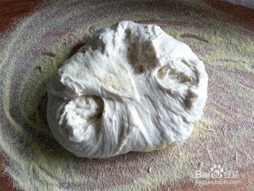 案板上放少许玉米面粉。把面团放在上面,略微整形
