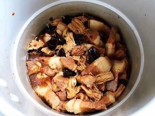 猪肉、腐竹、木耳和老卤汁倒入高压锅中,开火,炖30分钟。