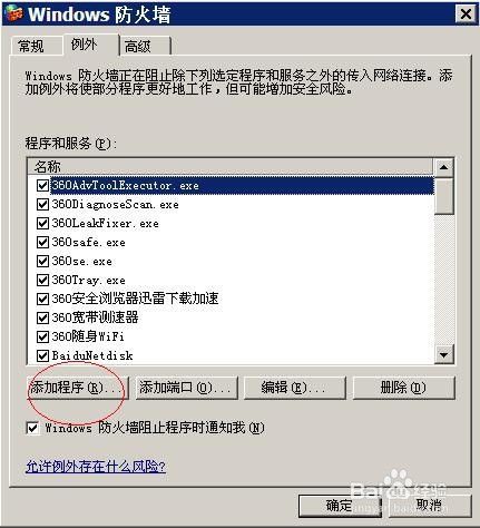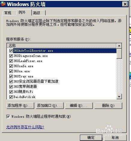 在防火墙设置的弹窗中选中“例外”界面卡,在下方列出来的程序中,勾选中的就是可以联网,如果不想某个程序联网,那么就取消勾选。
