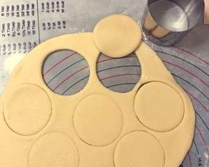 揉面垫撒点干粉,将面团擀成约0.2-0.3厘米的薄片 用模具或者小点的玻璃杯口径代替,压出一个个圆片。