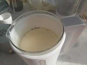 把煮好的南瓜块放入大宇轻养破壁机,泡好的大米、小米也一并加进去,再加入牛奶,接着加入南瓜水,达到最高水位线即可。