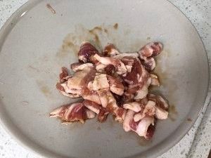 五花肉改刀,切小,放生抽,耗油,腌制一会儿。