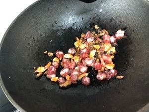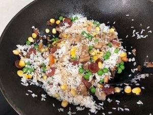 加入糯米饭翻炒,加入生抽上色调味