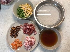 香菇,虾干切丁,腊肠切片,青豆玉米粒洗净,泡香菇和虾的水不要倒掉,混合待用