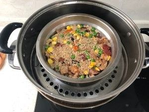 放上蒸锅,糯米饭,大火转中火蒸30-40分钟。