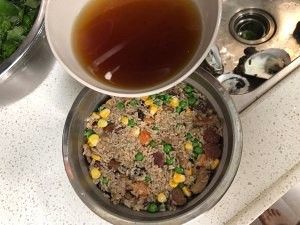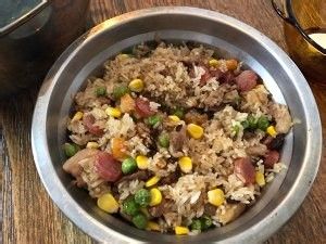 翻炒均匀以后盛起,加入香菇水,不用超过饭的高度,喜欢吃软糯一点的可以多加些水,喜欢颗粒明显的少加一点水