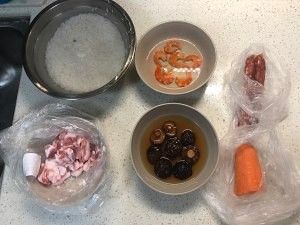 至少提前三小时泡糯米,我要睡懒觉所以提前一晚上泡,顺便泡了香菇,虾干,解冻五花肉,腊肠