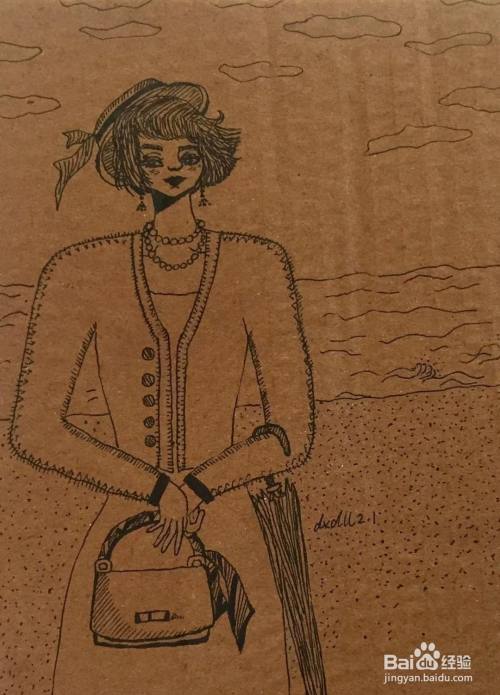 在爱莎服装袖口处画出双手,我们在其双手上画出包包。在露莎的胳膊内侧画出一把遮阳伞。