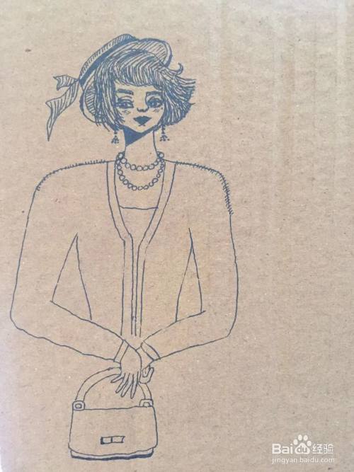 我们在露莎的头顶画出一顶礼帽。在露莎脖颈上画出项链,线条下沿画出双肩和服装轮廓。