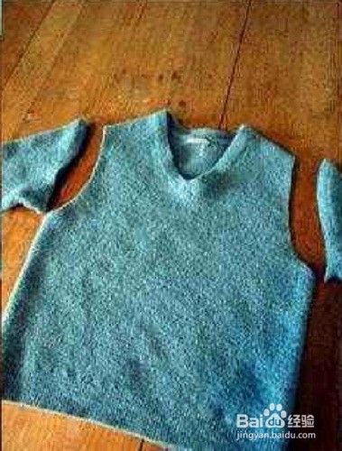 如果不想穿长袖毛衣了,我们可以改成马甲呀。将毛衣再桌子上铺好,将两个袖子减掉,注意要剪得有弧度一点,不会的可以拿短袖的衣服照着剪就可以了。然后将剪得袖口收一下边。今年最流行的马甲就完成了,时尚又经济。