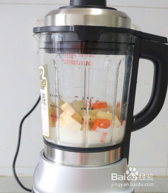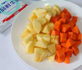 将胡萝卜块、苹果块和牛奶一起放进苏泊尔破壁机中