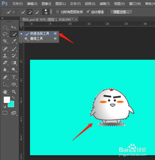 点击左侧工具栏的“快速选择工具”,将图片中需要羽化的部分选中。