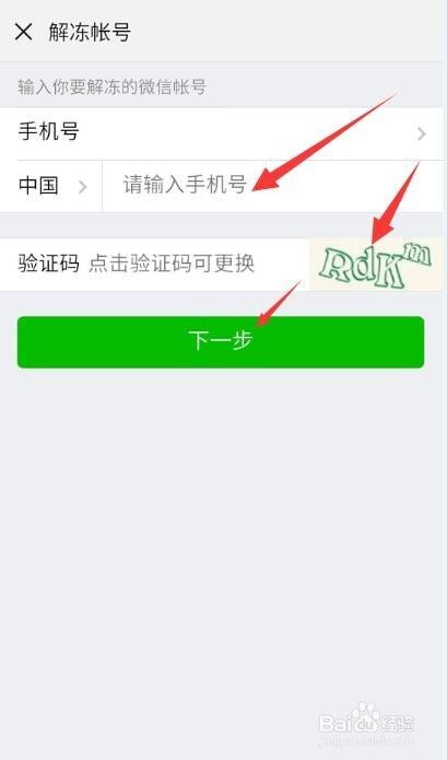 然后输入需要解冻的绑定微信的手机号码,输入右侧方的验证码,然后点击“下一步。”