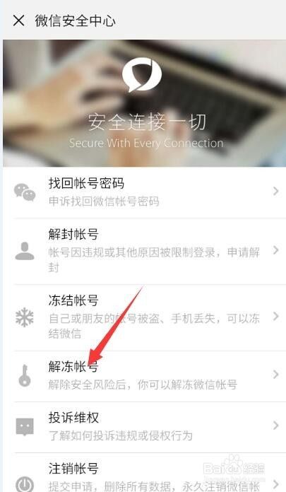进入微信安全中心页面,点击“解冻账号”,解除安全风险后,就可以解冻账号的了。