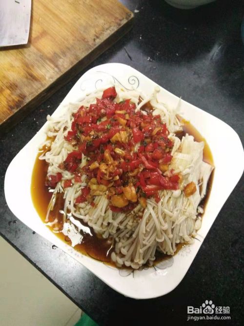 将辣椒炒熟后趁热淋在金针菇上,并倒入香醋即可食用。
