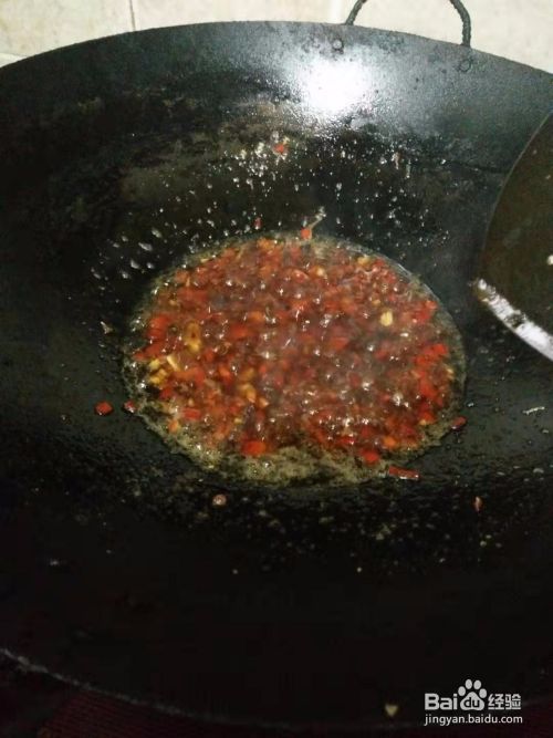 锅中倒油加热至七成,倒入切碎的辣椒和大蒜,加花椒一起翻炒,一分钟后加入盐,调味料,生抽翻炒。
