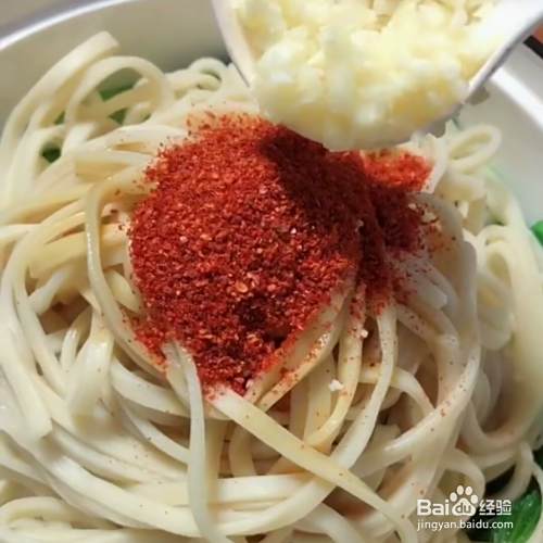 再放一大勺辣椒面、适量蒜末。