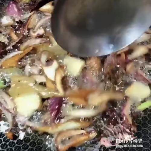 放入葱、姜、大料,炸香,捞出渣子。
