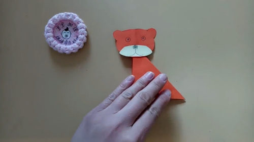 将折好的三角形和小熊头部贴合,用剪刀在身体下方剪一个凹口即可。