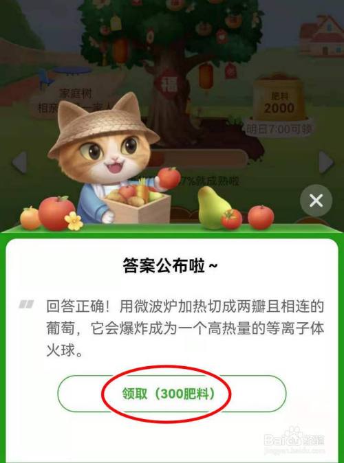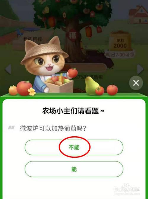 打开微波炉加热葡萄的问题页面,选择不能,回答正确,选择领取300肥料;