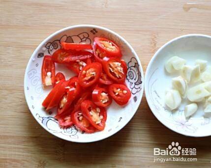 红辣椒洗净,切成椭圆形状,蒜拍一下去皮,切碎;