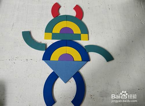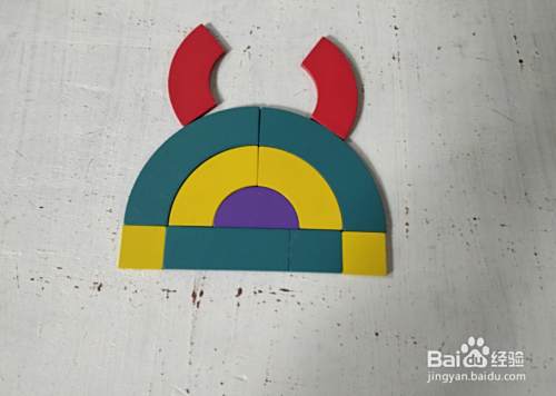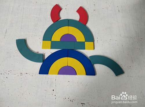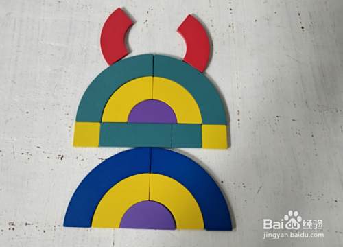 摆上左右挨着的蓝色弧形,下面摆上左右挨着的黄色弧形,下面摆上小半圆,放在下面,如图。
