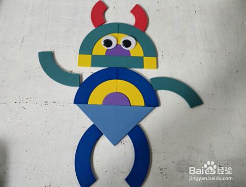 摆上眼睛,放在上侧黄色弧形上面,如图。这样就拼组好了。