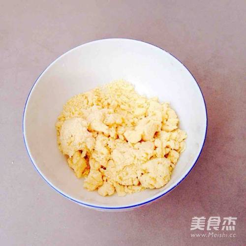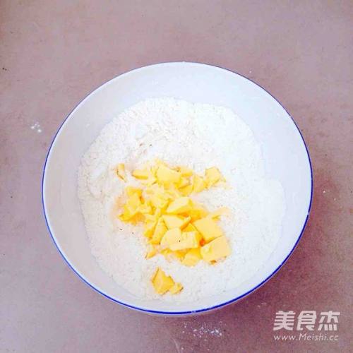 7把黄油碎和面粉揉搓成细腻无颗粒状。