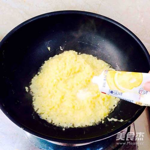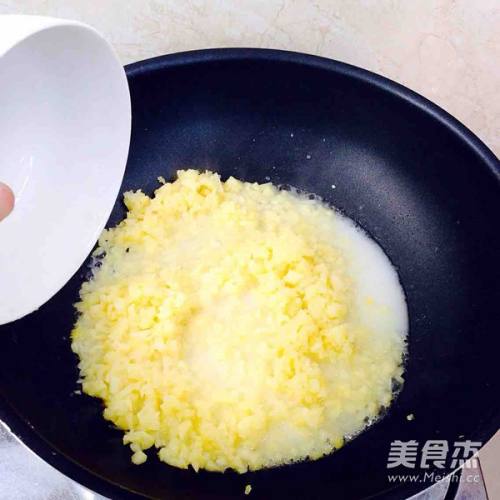 5炒至粘稠后放入练奶,和白糖拌匀后备用。