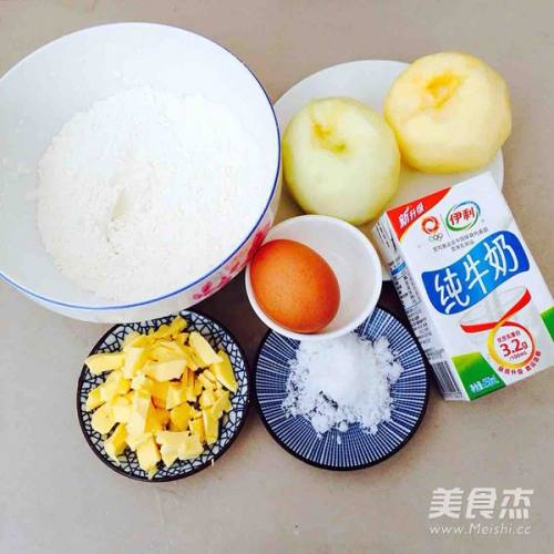 1食材:苹果,黄油,白糖,牛奶,鸡蛋,玉米淀粉,面粉,练奶。