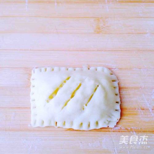 16用叉子把四周均匀的按压结实,在派皮上用厉刀划上气口。