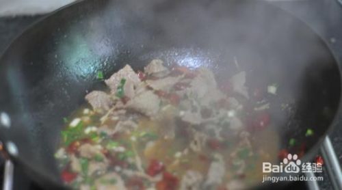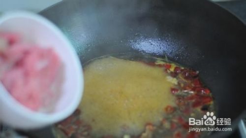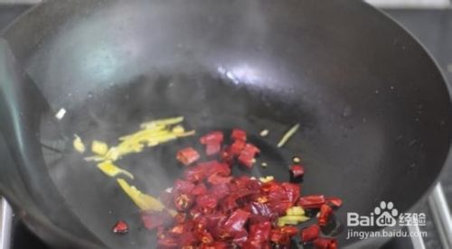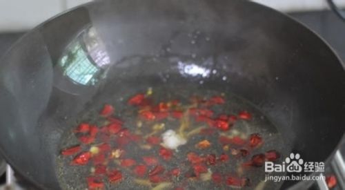 油锅烧热,爆香姜丝蒜末后,放入干红辣椒段,超出香味