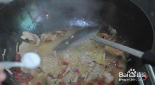 稍微翻动,让牛肉片均匀受热,微微变色,加入适量盐,翻拌均匀