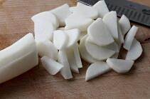 将白萝卜洗净切成半圆形的片。