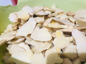 猪脚去杂毛洗净,飞水后捞出放入冷水中冲洗干净!晾干水分待用。