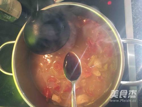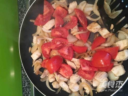 6加入酒翻炒1分钟,加入番茄,把番茄炒出红油