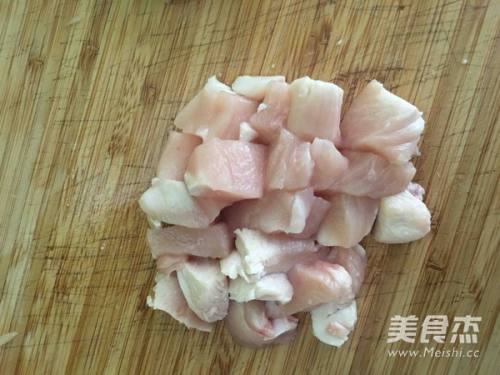 5倒入鸡肉块,放入二茶勺盐,翻炒
