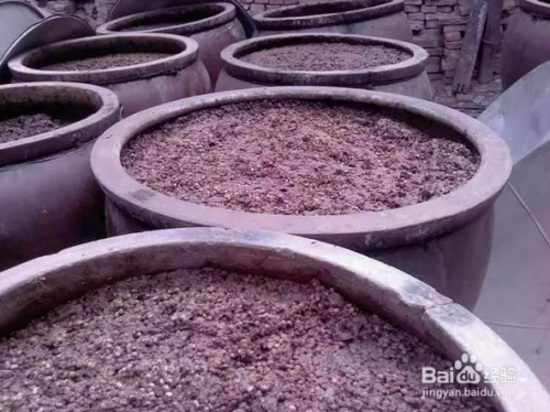 接下来就是烧水,把花椒、茴香这些香料放进去煮,煮个半小时就可以捞出来,放凉,再把花椒水倒进盆里,花椒水要漫住馒头,再放入酱曲和盐,一斤馍配三四两盐,然后搅拌均匀。用纱布盖住容器口,箍紧,在太阳底下晒。
