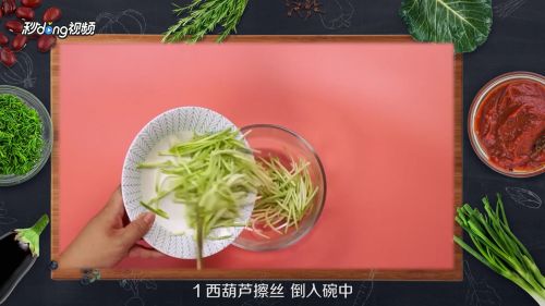 西葫芦擦丝,倒入碗中,加入盐腌制。