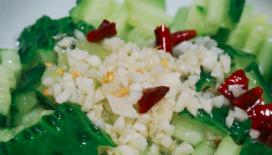 将煸好的辣椒蒜末油浇到黄瓜片上。