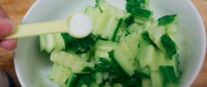 切好的黄瓜片中加入一克盐拌匀。腌制大概10分钟,等黄瓜腌出少许水,把水倒掉。