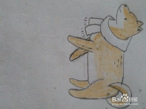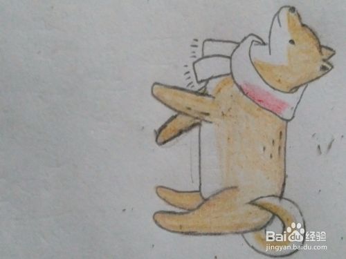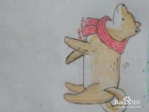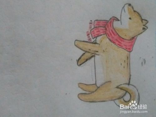 红色的彩铅将秋田犬的围巾颜色涂出来。围巾上我们也画出一些细节。