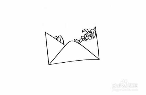 1、首先我们画出一个信封,注意画出信封折痕的纹理,在信封的开口处两侧画上小花、叶子装饰。