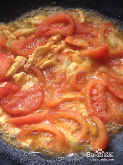 锅内放油,放入葱花爆香,将西红柿皮和西红柿块放入锅内翻炒至出来红色汤汁,炒的时候用铲子压一下西红柿,尽量让它们多出来些汤汁。