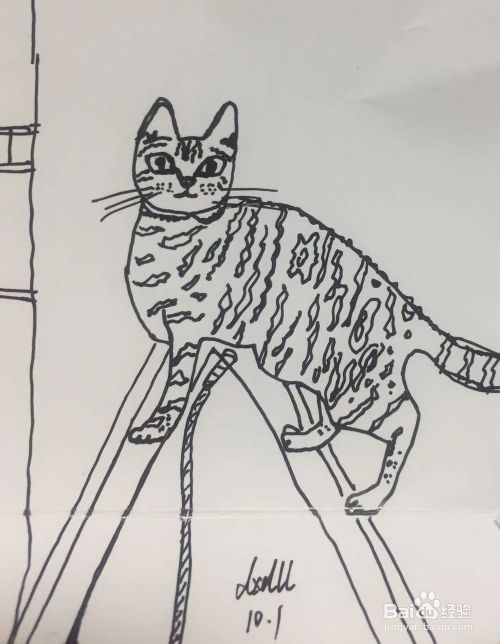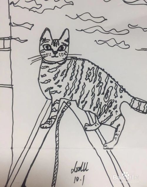 用笔画出喵星人的身体轮廓。我们在其身体上,用较曲的线条,画出它的毛发纹理。