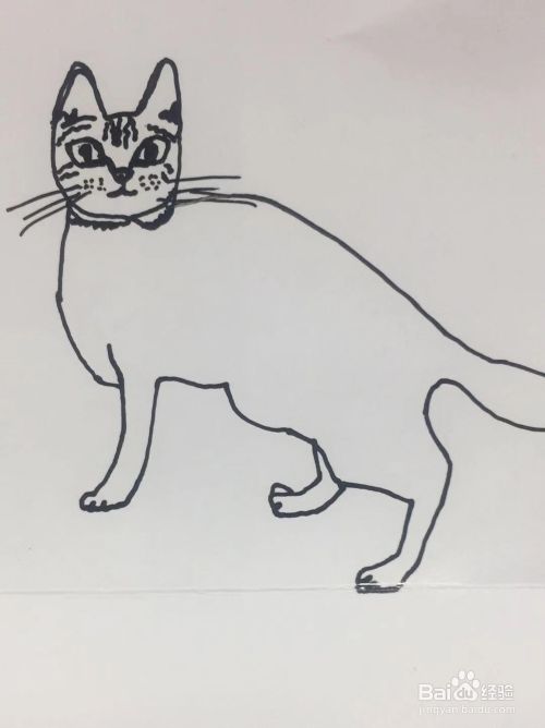 在白纸上用笔画出猫咪的头部轮廓。我们给猫咪的面部添加眼睛、鼻子、胡须和嘴巴。