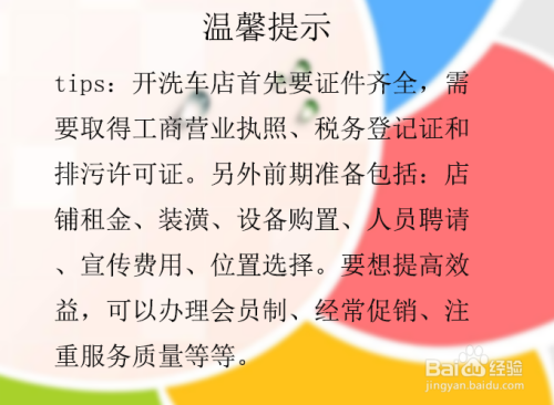 tips:开洗车店首先要证件齐全,需要取得工商营业执照、税务登记证和排污许可证。另外前期准备包括:店铺租金、装潢、设备购置、人员聘请、宣传费用、位置选择。要想提高效益,可以办理会员制、经常促销、注重服务质量等等。