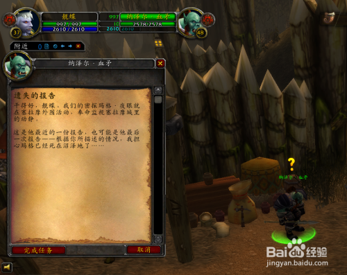 在尘泥沼泽水光庄园房子左边找到一堆“松软的泥土”(坐标55,26)接的任务,需要把“间谍的报告”交给尘泥沼泽蕨墙村的“纳泽尔·血矛”(坐标35,31)。